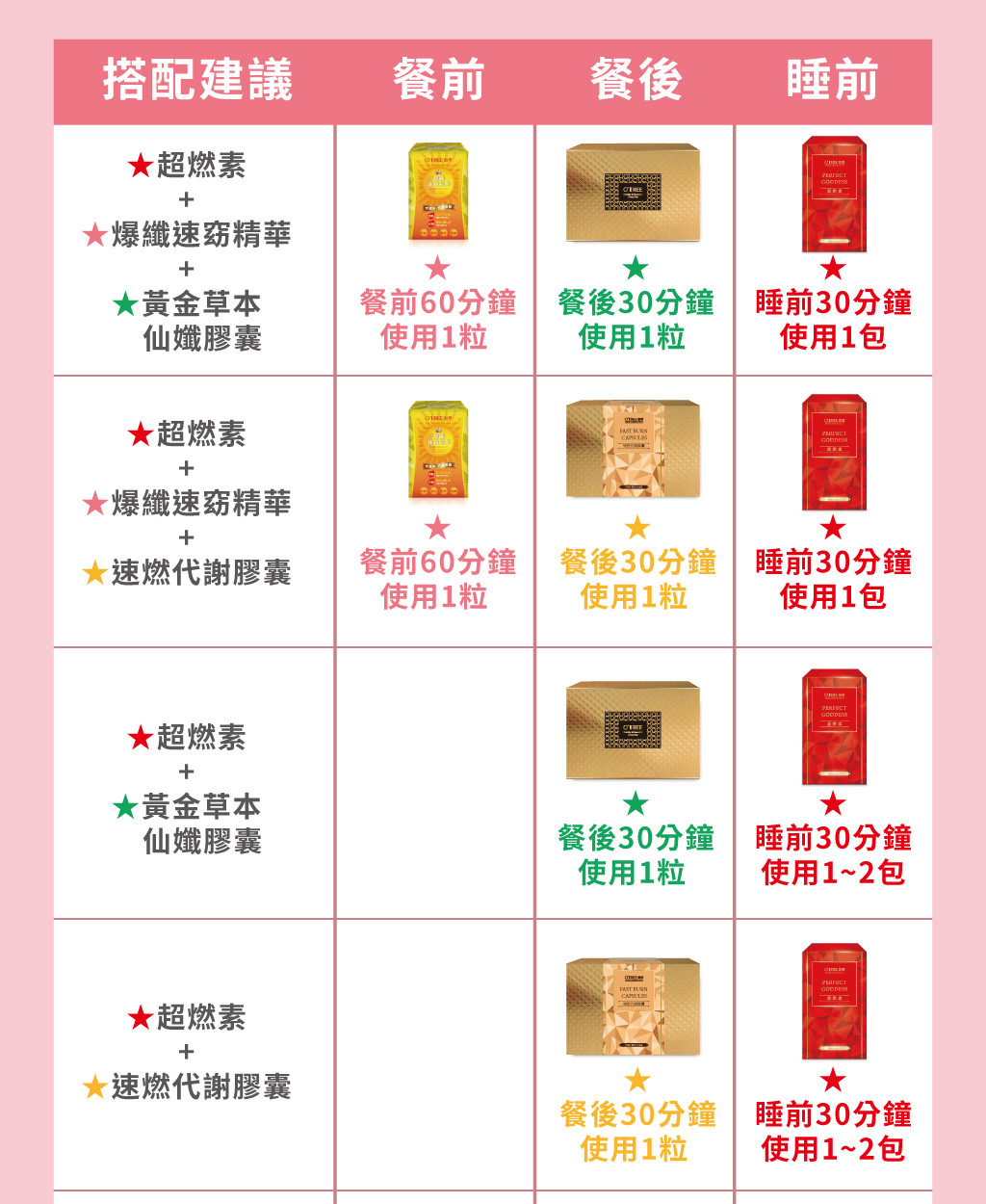 | 使用時間 | 餐後 | 下午3~4點 or 睡前30分(擇一即可) |