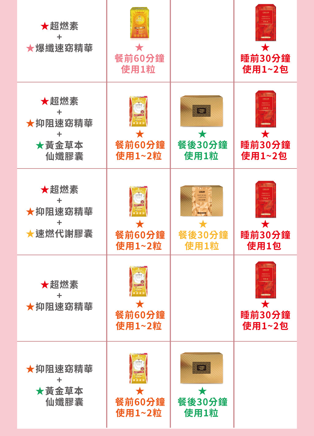 | 組合內容 | 速燃代謝膠囊 | 超燃素 |